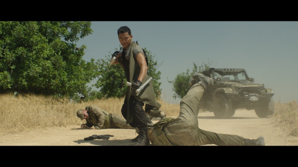 Jaa es parte de la mejor secuencia de acción de Jiu Jitsu, en la cual su personaje es introducido y eventualmente pelea al lado de Moussi. Se trata de una secuencia dinámica, tiene trabajo con cámara en mano, algo de slow-motion y tomas en primera persona. Para Logothetis, “Tony Jaa es intocable. Quería crear una secuencia continúa con Tony corriendo, saltando encima de las paredes y sobre los tejados. También quería que tuviera una vibra de videojuego, por eso cambié el punto de vista. Quería que la audiencia pensara en un videojuego, pero a la mitad de la secuencia, quería que se dieran cuenta que son artistas marciales reales, logrando proezas atléticas. Traté de alejarme de los trucos, sólo tener los suficientes efectos y CGI para vender la ciencia ficción. Pero si te das cuenta, la mayoría de la película gira alrededor de las artes marciales, puedes disfrutar del atletismo de los intérpretes”.