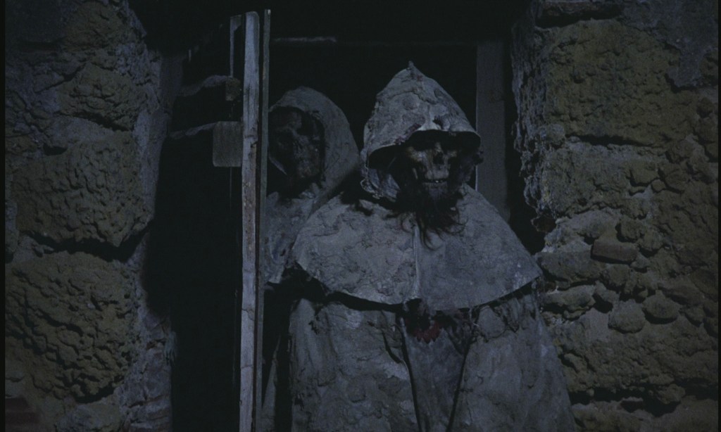 De Ossorio aprovecha el pueblo para construir una gran atmósfera, que contrasta con las demás locaciones de su película. Una de las mejores secuencias es prácticamente silente: inicia con una solitaria Virginia explorando el pueblo hasta que decide prender una fogata para pasar la noche leyendo y escuchando su radio. Con el tañido de unas campanas, en el cementerio se erigen los cadáveres de unos caballeros medievales. La presencia de estos antagonistas es genuinamente imponente, aterradora: cadáveres encapuchados a caballo –también encapuchados–, que sin prisa alguna convierten a la protagonista en su nueva víctima. Es una secuencia hipnotizante, una de las grandes presentaciones de personajes horríficos.