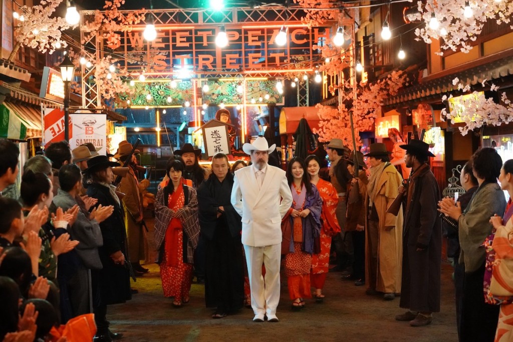 BM: Que era la fusión perfecta entre Este y Oeste, esta mezcla fue una de las cosas emocionantes de estar en el set. Realmente se sentía como un pueblo del viejo y salvaje Oeste, especialmente por las calles de tierra. Obviamente era muy japonés también con todas las flores de cerezo, las hermosas geishas, los ninjas y los samuráis. Me encantó, pensé que era fantástico.